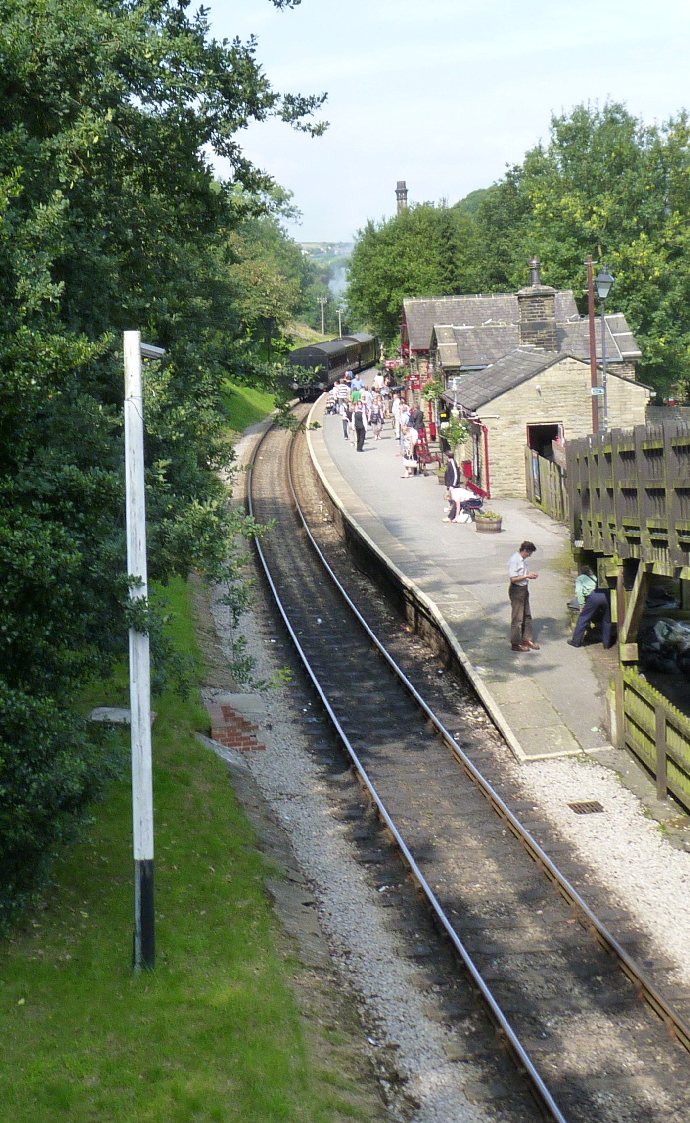 You can always see the steam first from Oxenhope Station, and as the engine hove the round the curve in the cutting it made a splendid sight. It was a LMS 5212 , a splendid engine named a 'Black Five' which was rarely seen on the railway as it was such an imposing beast that it was most sought after, and leant to, other railways. It was capable of pulling a great deal more than some of the smaller engines used by the line, and liked to announce itself with proportionate proclamations. Accordingly it made more noise, smoke and steam and was altogether much impressiver!