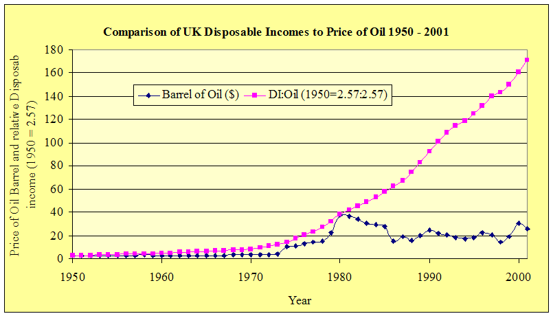 Fig #f compares the trends in average disposable income and the cost of a gallon of petrol over the second half of the twentieth century. (No weighting has been made to account for inflation as it is a comparison of contemporary prices). It should be born in mind that petrol elasticities will largely only apply to that portion of the population who purchase petrol, therefore it might be more accurate to consider only that particular set within society. In 1951 a barrel of West Texas Intermediate averaged $2.57. By the year 2001 the market price was over $30 dollars a barrel (although as early as 1980 the price had reached $37, the price volatility of the product reflected in its 1997 average of $14.39). A more consistent and marked rise in disposable income has seen a steady increase in not only actual, but also real (i.e. weighted for any given year) terms. It seems there was a significant change in the correlation of oil prices and disposable income sometime around 1980 when it can be seen that the latter galloped away, making the cost of oil to the consumer very much and increasingly cheaper on a year on year basis.