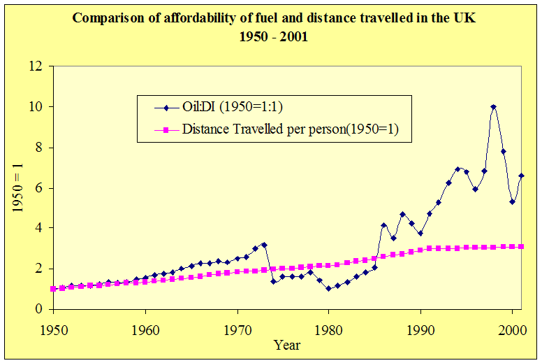 Fig #f indicates a comparison between the trend of cheapening of fuel and the rise in distance travelled. The trend lines in figure 4 above are expresses as a ratio when the cost of oil: and Disposable income in 1950 was 1:1. Assuming an average Briton in 1950 could afford 1 unit of oil, the trend line shows how many of those units he might afford on a year by year basis. Again assuming that in 1950 the same average Briton travelled 1 unit, the second trend line illustrates how far he has travelled each year since.