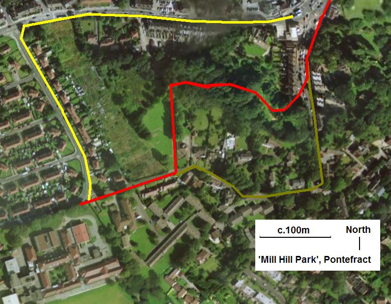 | Mill Hill Park from the air showing the closed route in red (slightly less tha 600m from the point of divergance near the King's School to Roperegate end in the North East) and the alternative routes, by very busy road (olive, just over 600m and yellow, about 700m) |